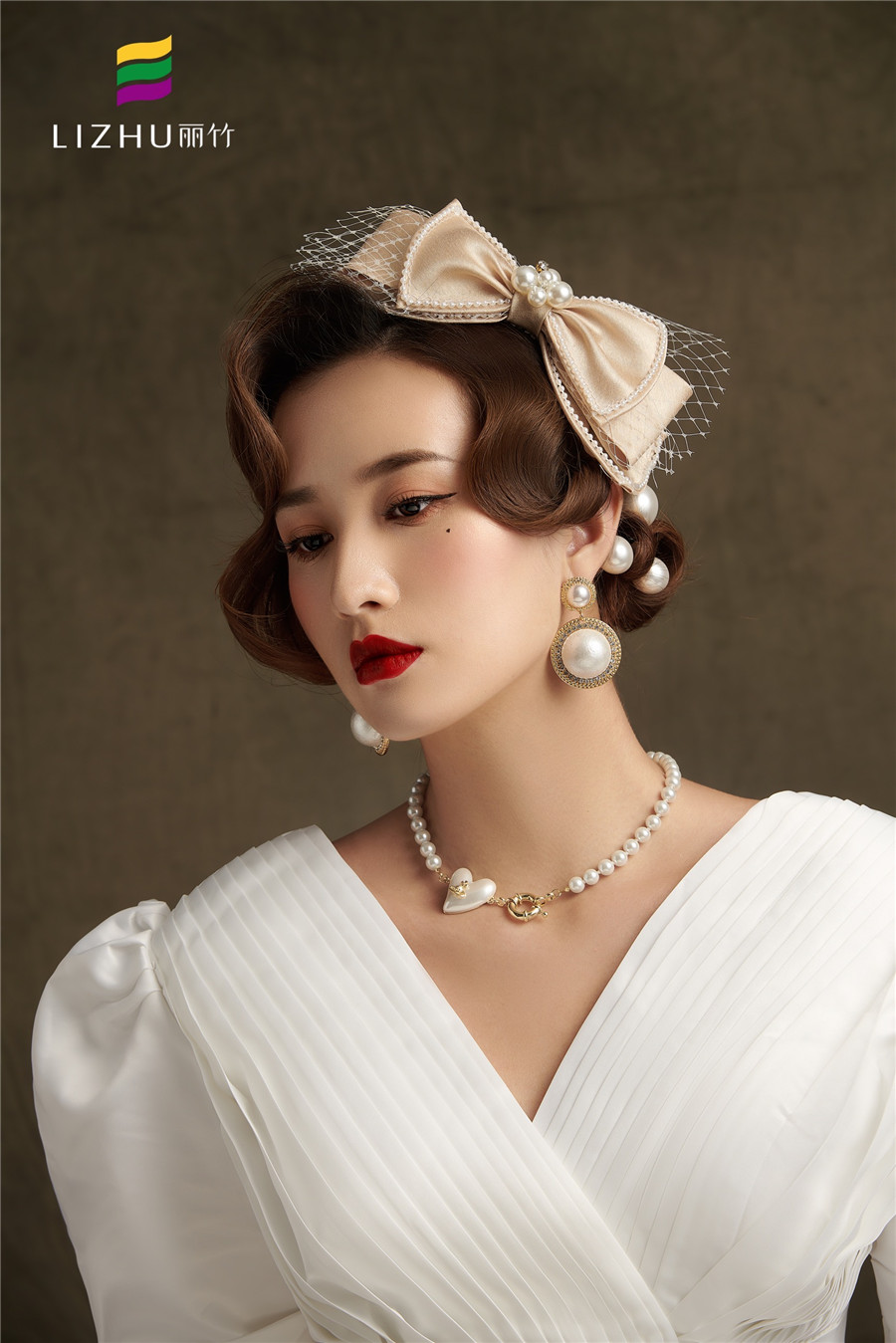 佩戴香檳蝴蝶結(jié)頭飾點(diǎn)綴