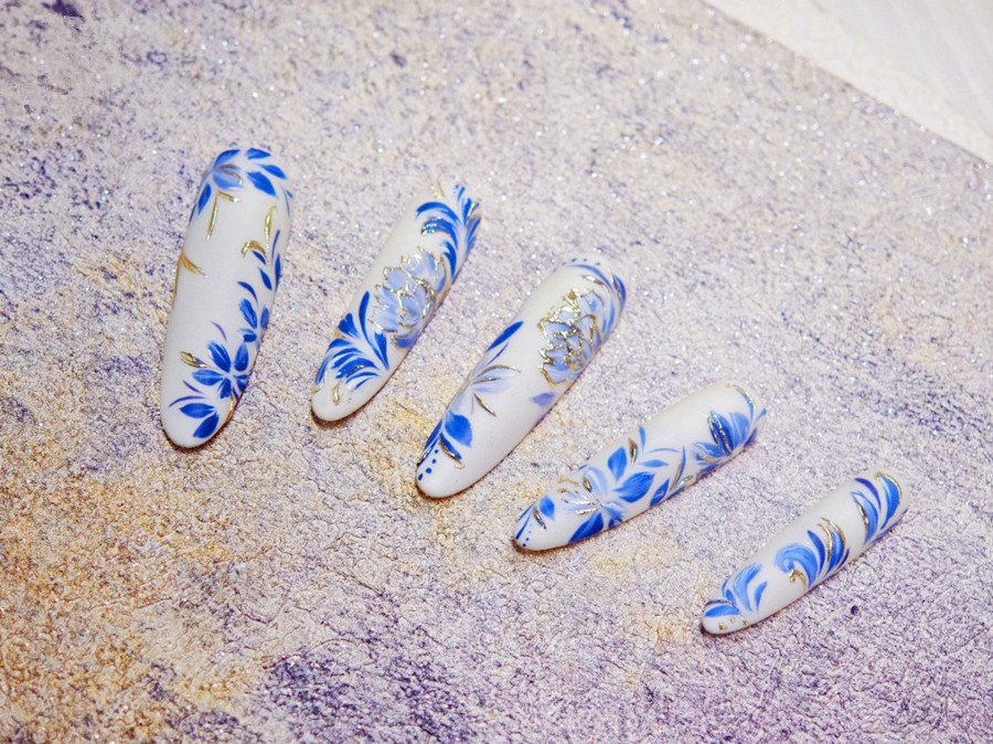美甲款式小紅書、南寧美甲學(xué)徒:“素胚勾勒青花”,因?yàn)楠?dú)特的文化底蘊(yùn)和精美的做工,青花瓷可以說是俘獲了整個(gè)銀河系人們的心。而當(dāng)這濃淡相宜的青花跳躍到了甲片上…