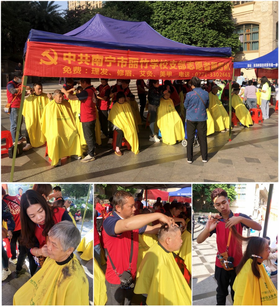 廣西理發(fā)師、廣西理發(fā)剪發(fā):廣西美發(fā)理發(fā)學(xué)校-麗竹學(xué)校美發(fā)志愿者服務(wù)隊(duì)走進(jìn)南寧市各大小區(qū),為居民們帶去冬日暖陽(yáng)里力所能及的免費(fèi)理發(fā)活動(dòng)。廣西理發(fā)剪發(fā),廣西專(zhuān)業(yè)剪發(fā),廣西培訓(xùn)理發(fā)志愿者服務(wù)隊(duì)為東溝嶺,人和萊茵社區(qū),翰林山水源外提供免罰理發(fā)。