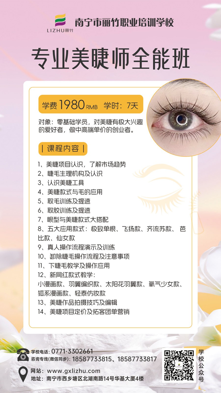 南寧美睫師、零基礎(chǔ)學(xué)美睫:寧美睫培訓(xùn)學(xué)校-麗竹學(xué)校美睫課程教學(xué)技術(shù)成功全面升級(jí)!美睫學(xué)費(fèi)優(yōu)惠活動(dòng)持續(xù)進(jìn)行,截止日期為5月30日。如果你想在南寧學(xué)美睫,想做南寧美睫培訓(xùn)學(xué)費(fèi)哪里便宜?那現(xiàn)在就不要猶豫,趕緊聯(lián)系我們報(bào)名吧!拼手速的時(shí)候就是現(xiàn)在。畢竟,你還在猶豫不決時(shí),別人已經(jīng)開始行動(dòng)了。