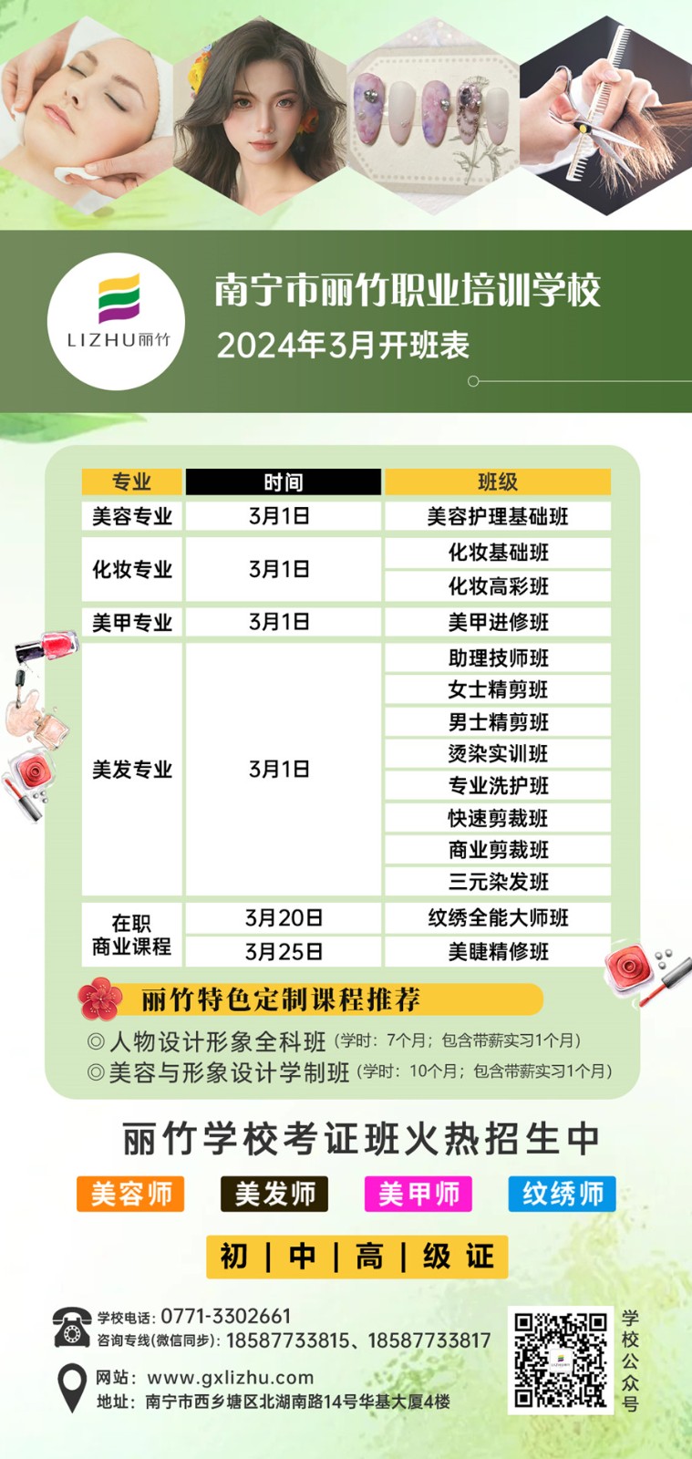 如果你想學(xué)習(xí)美業(yè)技術(shù),想在廣西零基礎(chǔ)學(xué)美容美發(fā)?想知道廣西化妝美甲培訓(xùn)在哪里?廣西哪里學(xué)紋繡專業(yè)?同時還想到廣西美睫學(xué)校去學(xué)美睫?那么,請你千萬不要錯過廣西美業(yè)專業(yè)職業(yè)學(xué)校-麗竹學(xué)校3月的開班安排了啦!早學(xué)早就業(yè),就能早點(diǎn)實(shí)現(xiàn)人生目標(biāo)。